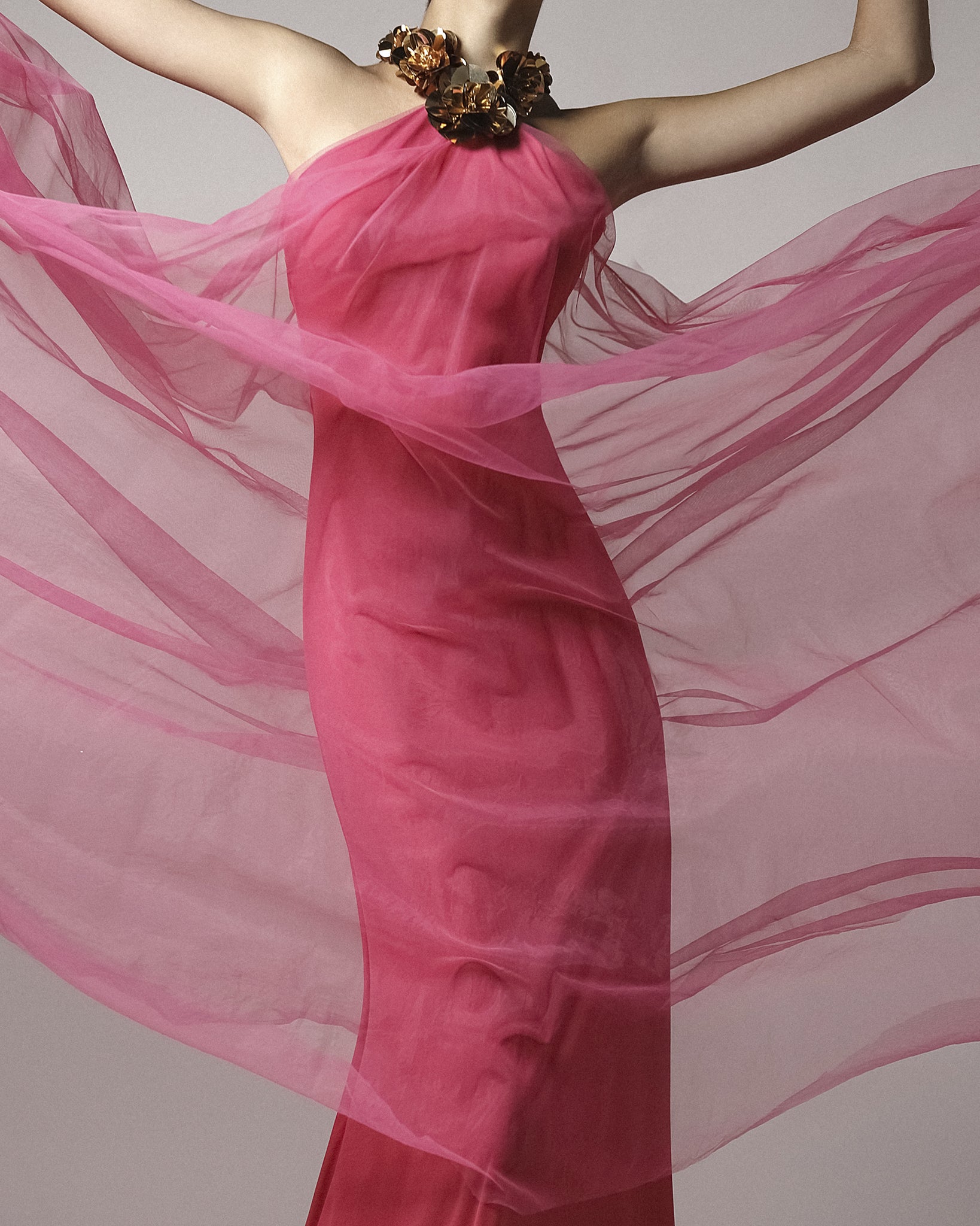Vestido largo halter tul. Flores doradas 3D en cuello.